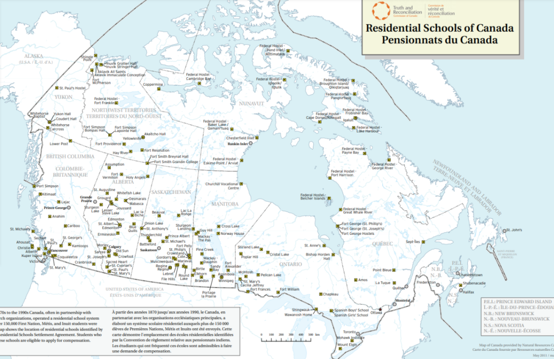 在19世纪70年代至1997年间,超过15万的原住民和因纽特儿童被迫进入由教会经营并由政府资助的学校。目前已知的就有4100多名儿童在这些学校上学期间死亡。而那些活下来的,也并没有好到哪去,研究认为这些寄宿学校的经历是原住民遭受巨大创伤的最主要因素之一。