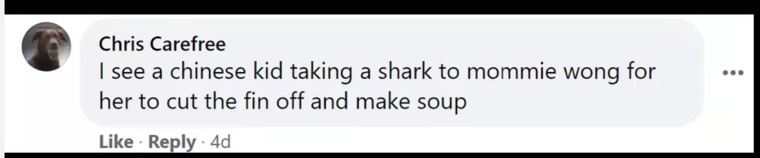 有些FB群组中甚至出现了更令人气愤的言论。明明是一件倡导保护海洋,保护动物的作品却被人完全理解成了相反的意思——“鱼翅汤“。如此具象的作品其实不难让人联想到其表达的正面观点,但评论的人不仅没有试图了解作品的寓意,还加入了主观负面的解释,让人无法不去揣测他们的真实用意。