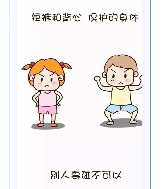 从幼儿时期就该告诉孩子,身体的哪些部位不能随便被人碰触。比如“小背心小裤衩遮住的地方不能碰”。