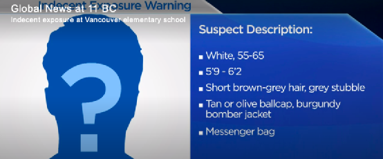 6月7日下午2点至2点30 分之间,一名男子在温哥华西区Bidwell和Pendrell街附近的 Lord Roberts小学的操场上接近了一名8岁的女学生。这名男子向小女孩暴露了他的XX。