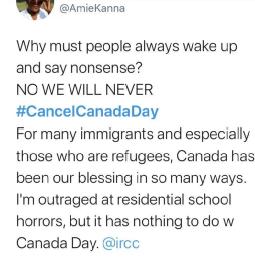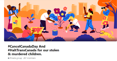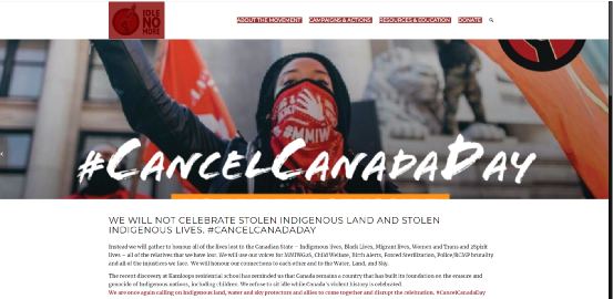 一个原住民维权组织“Idle No More”成为这个话题的倡导者之一,它在Facebook页面上写道:“加拿大仍然是一个建立在对包括儿童在内的原住民进行清洗和种族灭绝基础上的国家。当人们庆祝加拿大的暴力历史时,我们不会坐视不管。”