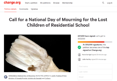 支持者们还发起了一个请愿活动,呼吁设立一个全国性的悼念日,悼念那些在全国各地所有原住民寄宿学校中遇难的学生。目前这项请愿在change.org网站上已有22万人签名。