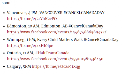 更有甚者,为了配合取消加拿大国庆日的呼吁,一个名为“#HaltTransCanada for our stolen & murdered children”(为我们被偷走和谋杀的孩子们封锁加拿大公路)的活动组织者要求人们响应安省原住民的倡议,7月1日当天举行5小时的大型全国抗议活动,封锁贯穿加拿大的最主要公路TransCanada ,纪念原住民数百年间被占领、殖民和反抗的痛苦。