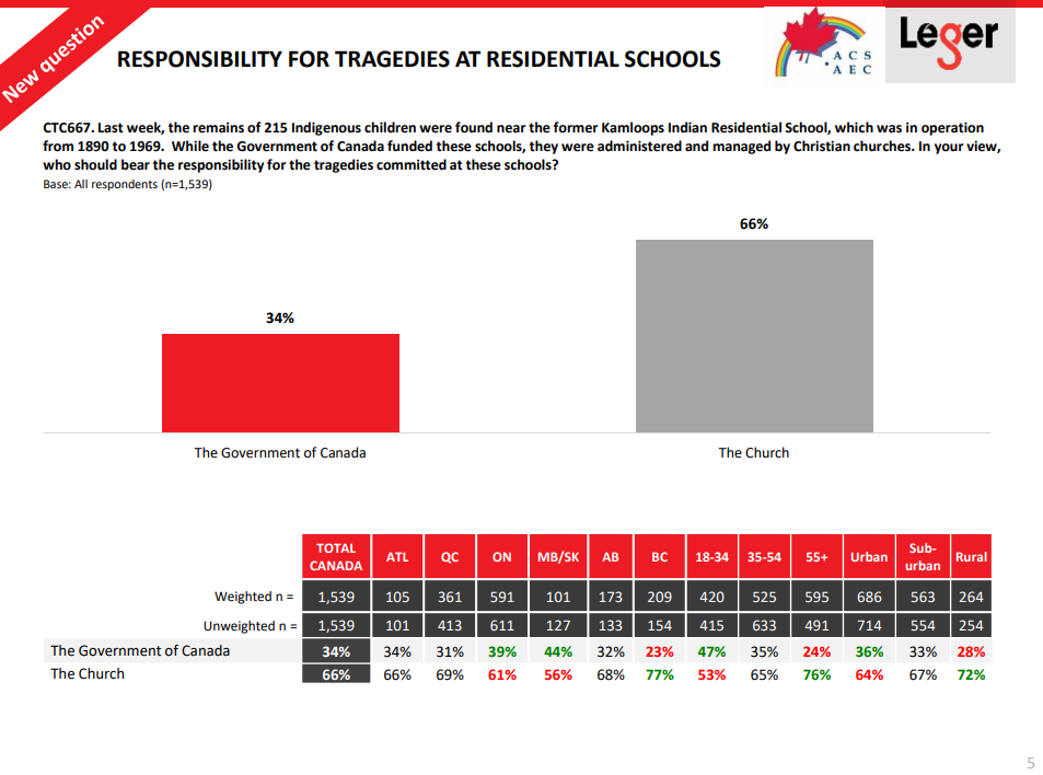 Leger调查公司就早先在温哥华坎卢普斯印第安寄宿学校(Kamloops Indian Residential School)发现的215具原住民儿童遗骸等诸多问题做了一项民调。