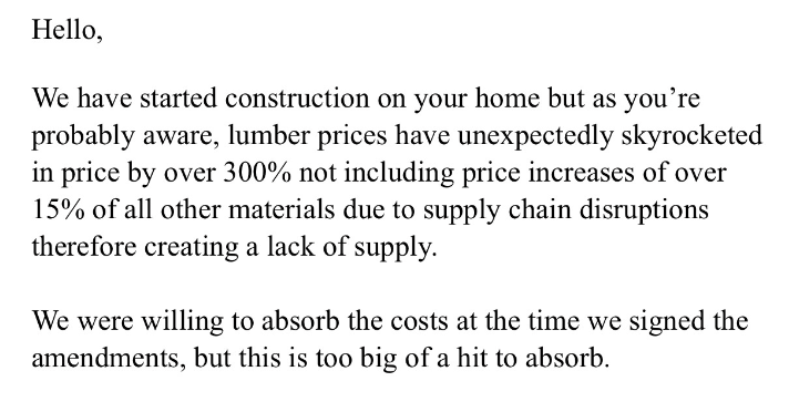 有开发商告诉媒体,通常他们会留出18%的建筑成本上涨空间,但今年木材价格最高点比一年前上涨了200%。