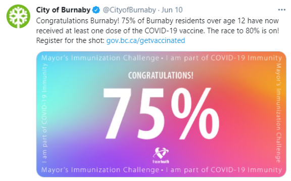此外,据大温本地媒体Burnaby Now报道,本拿比新冠疫苗接种运动已完成历史性一刻:该市所有有资格接种新冠疫苗的市民中(12岁以上),有75%已至少接种了一剂疫苗。