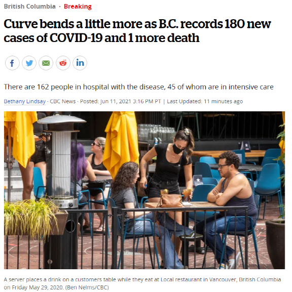 活跃病例6月11日已下降至1880例。BC省目前收治新冠病例162人,相比7日前下降了28%。现在,医院的新冠病患总数已低于第三波疫情高峰期在重症监护室抢救的人数。