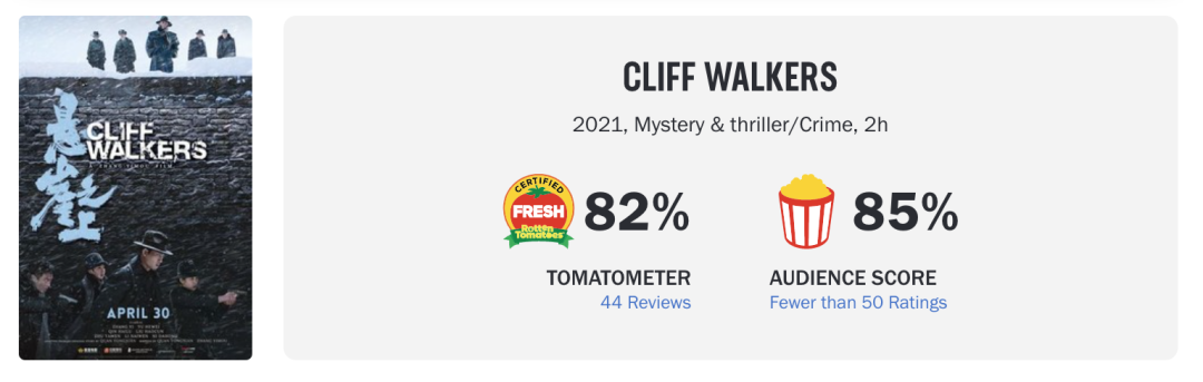 此外电影更是在外网地区也拿下超高口碑,烂番茄已获新鲜认证!拿下44家主流媒体高达82%和85%的爆米花指数!