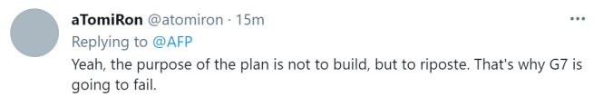 有网友则更为直接地表示:这个计划的目标不是为了建设,而是还击。这就是为什么G7将会失败的原因。↓