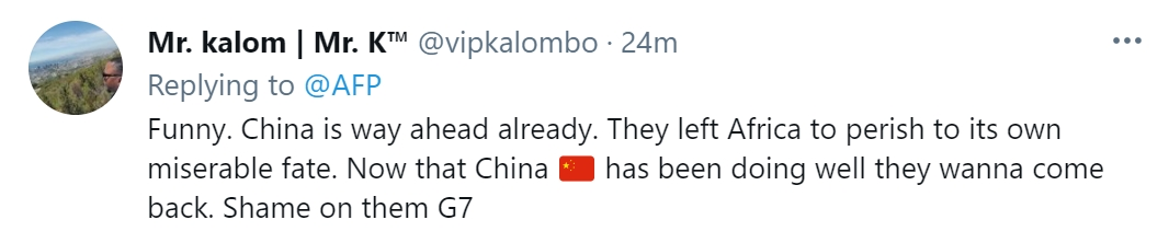 还有网友讽刺说,“搞笑。中国已经遥遥领先了。过去,他们(西方)让非洲自生自灭,悲惨地走向灭亡。现在中国做得很好了,他们又想回来。G7真无耻。”↓