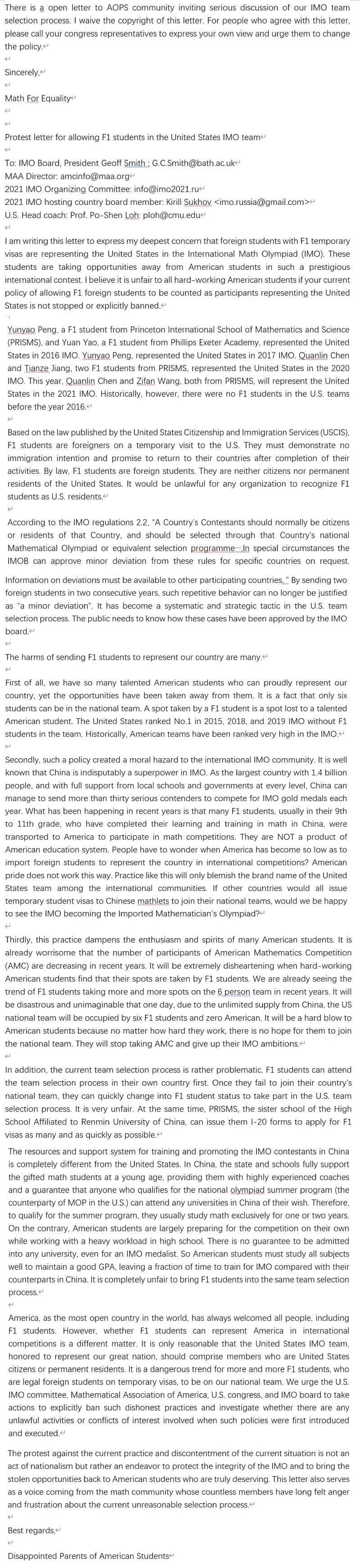 这封信是写给整个国际数学竞赛圈,并以电子邮件的形式分别发给国际奥数竞赛委员会主席Geoff Smith 教授,美国数学协会主任 MAA Director,2021年国际奥数竞赛组委会,2021年国际奥数竞赛举办国俄罗斯奥数委员会,美国IMO国家队教练罗博深。