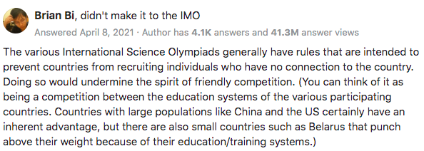然而,在国际数学奥林匹克竞赛(IMO),这条规则并没有被很好地编纂成法律,它只是说你是「公民或居民」就可以参赛。