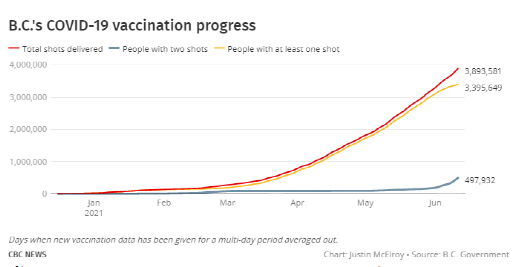 迄今为止,BC省已有75.9%的成年人接种了第一针疫苗,12岁以上的人群中,也有74.1%接种了第一针。