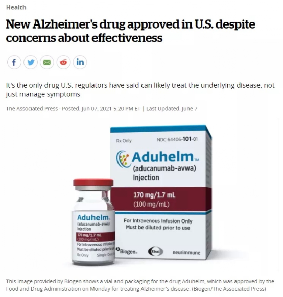 6月7日,美国FDA刚刚批准了近20年来第一个治疗阿尔茨海默症的新药Aduhelm,这也是美国监管机构批准的唯一一种能够治疗阿尔兹海默症的药物,而不仅仅是控制症状。