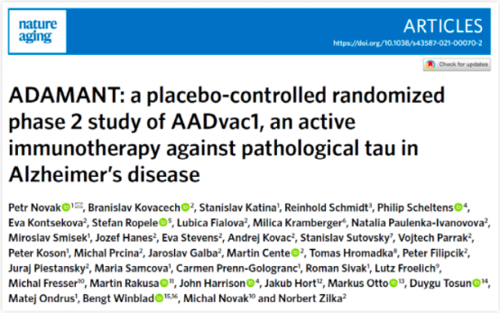 2020年,Axon Neuroscience公司又完成了该疫苗的一项2期随机安慰剂对照试验,入组了196名轻度阿尔茨海默病患者(平均年龄71.4岁、45.1%男性、100%白人)。研究人员替这些患者注射了多剂名为AADvac1的多肽疫苗或安慰剂,并在近2年的时间里监测了该疫苗的安全性、免疫原性(即疫苗诱导免疫应答的能力)和临床效力。