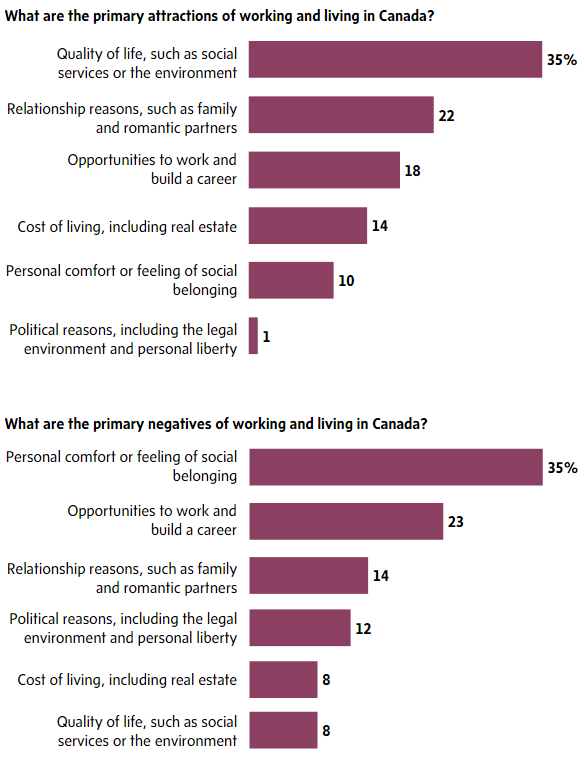 在加拿大生活,学生们更喜欢的是其生活质量,例如环境和社会服务,其次是朋友、家庭和情侣关系。而最令人难以接受的,就是没有归属感。