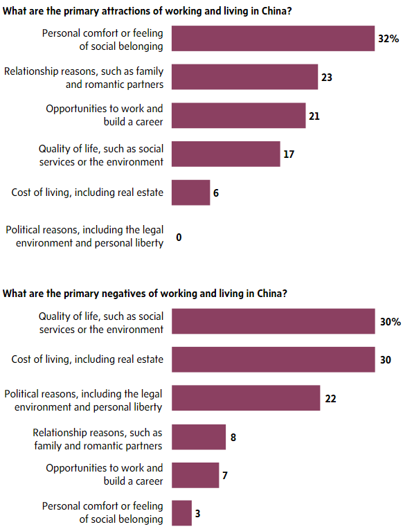 而在中国生活,这两者正好相反。最令学生们青睐的,则是能获得满满的归属感,但生活环境以及社会服务质量,却成了最大的缺点。