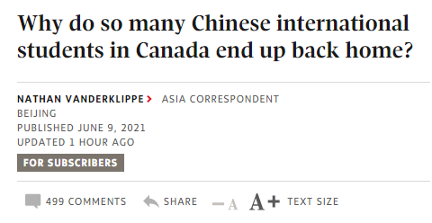 香港大学社会科学教授,David Zweig表示,留学生中很多是靠钱出去的。他们通过留学,规避开对他们不利的考试方式,然后在加拿大学习技能,