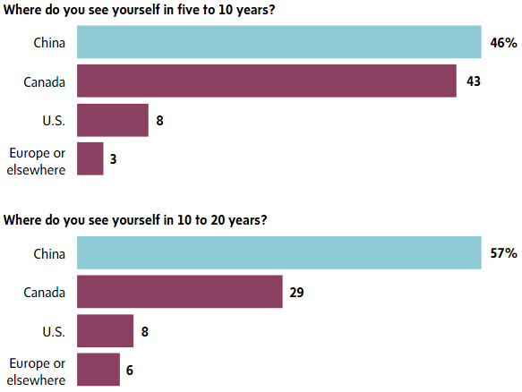 当提到最终定居地,如果在10年内,有不到半数学生选择留在加拿大,这与回国学生数量相差无几。但如果是10年后,选择回国的学生比例增加11%,而留在加拿大的人则大幅减少。