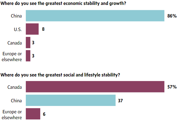 就经济稳定和发展而言,绝大多数学生认为中国是最理想地。而社会和生活稳定性方面,有超过半数学生倾向于加拿大。也许中国对境外人的吸引力在变小,