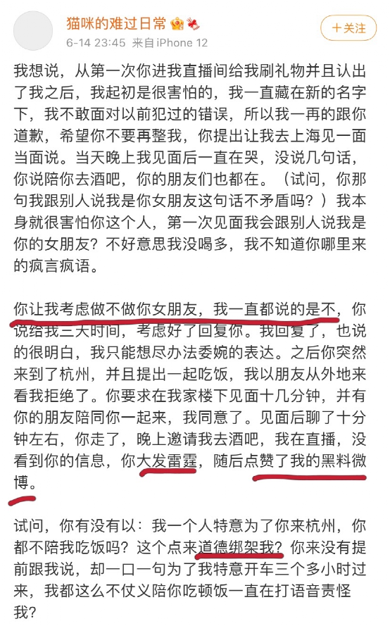 没想到孙一宁抢先自爆,用网名“猫咪的难过日常”在微博上发了长文,隔空喊话王思聪,说他对自己“道德绑架”。