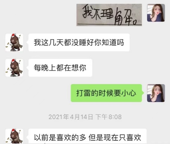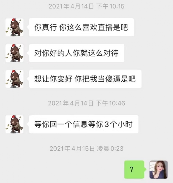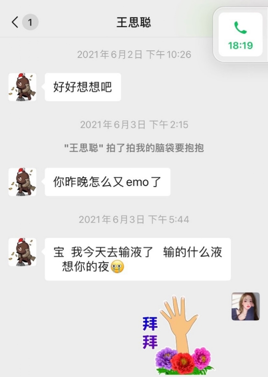 为了博得美人心,王思聪于是再接再厉,对孙一宁继续发动攻势。为了她不惜杀到杭州,等她回信息能等3个小时,说自己不看到她就睡不好,还撒娇说妹子对他爱搭不理,说她“你都不知道心疼人的”。整个人像一个大写的“怨妇”!