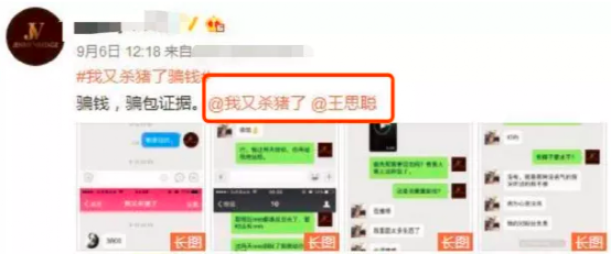 品牌方一气之下爆料说她骗钱,向她索赔,还公然艾特了王思聪。