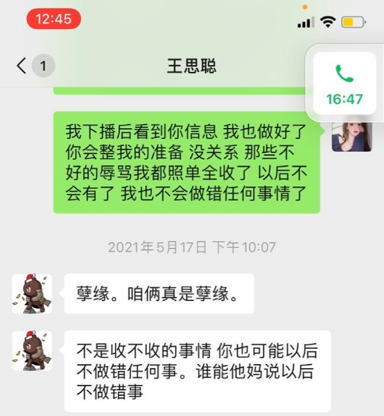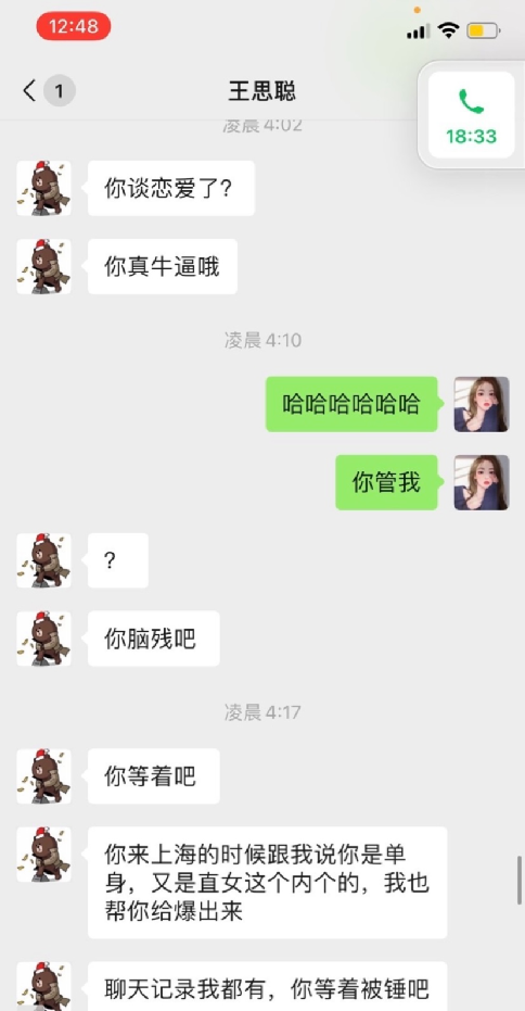 据说王思聪追在孙一宁后面当了4年舔狗,始终未能一亲芳泽。直搞到妹子不堪忍受大爆粗口,把这位前任首富之子公开“处刑”挂上微博。王思聪则大骂对方是“杀猪女”,欺骗他的感情。两人你来我往互揭老底,面子里子全都丢了个干净。