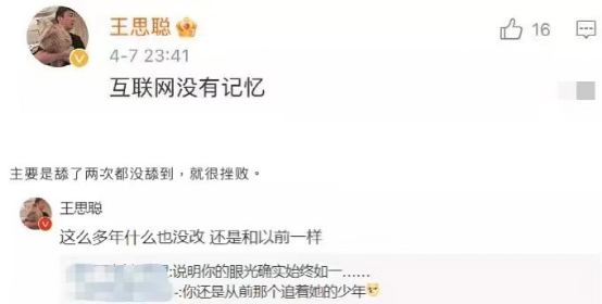 王思聪发现之后还在微博发了一条挽尊的话“互联网没有记忆”,被网友嘲笑说“你还是从前那个追着她的少年”。