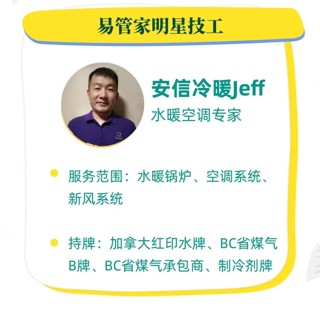 易管家明星技工Jeff,服务大温地区超过十年,资深新风系统、空调系统专业技工。持有加拿大政府颁发的专业制冷系统服务资质。