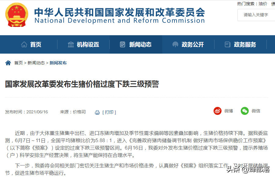 据发改委官网6月16日发布的《国家发展改革委发布生猪价格过度下跌三级预警》消息认为,“下一步,我委将会同相关部门密切关注生猪生产和市场价格走势,认真做好《预案》组织落实工作,及时开展储备调节,促进生猪市场平稳运行。”
