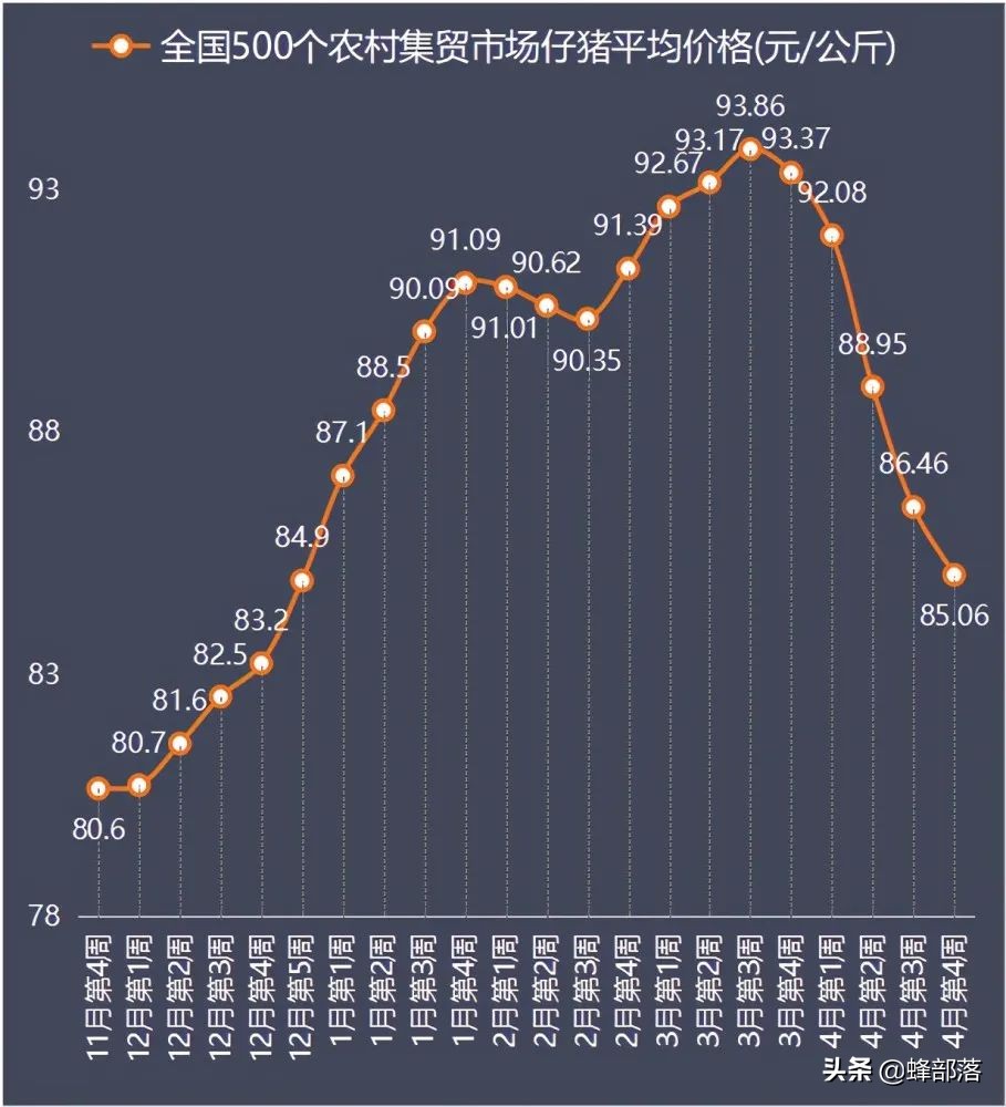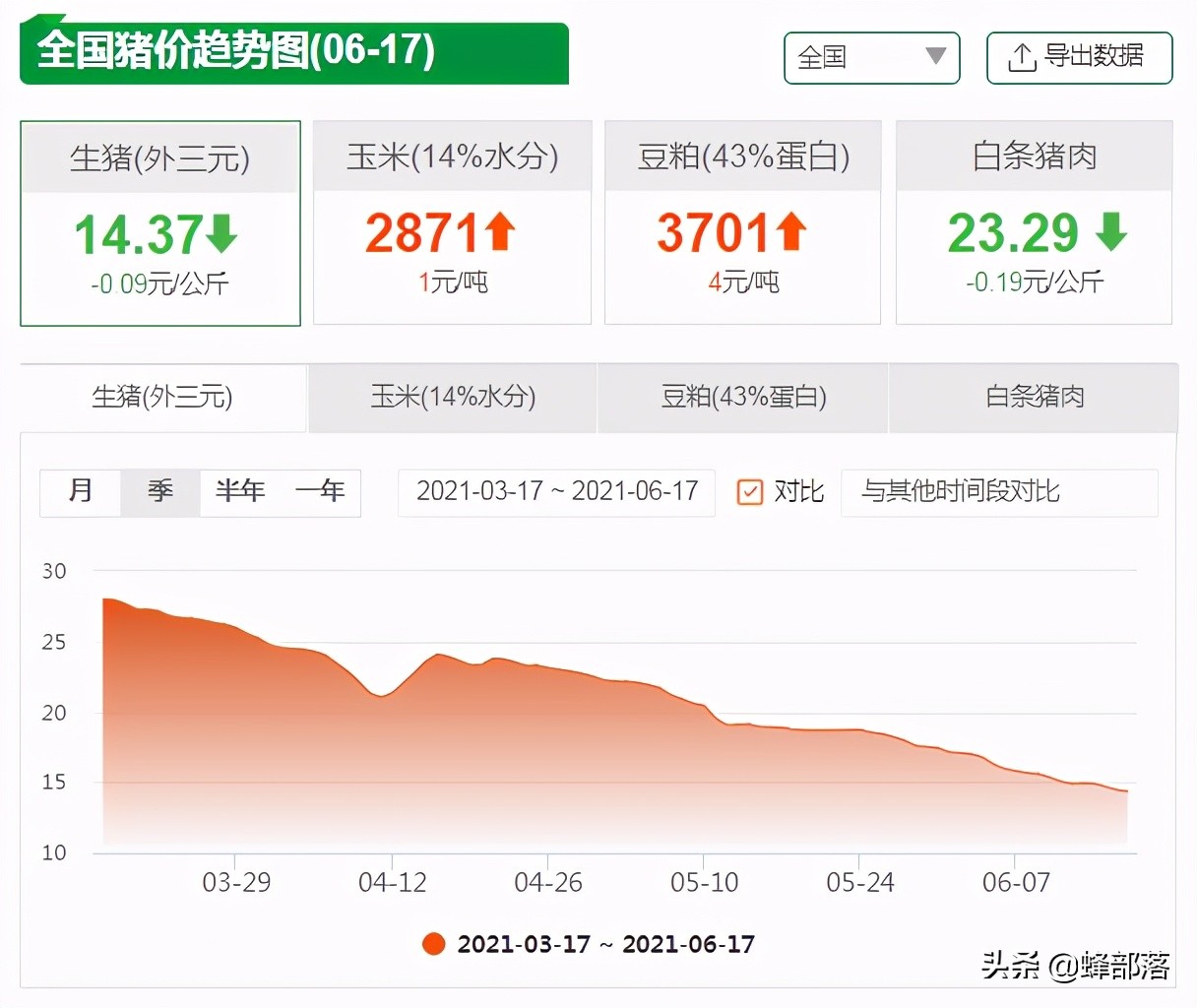 今天外三元生猪全国均价为14.30元/公斤,比昨天下跌了0.08元,环比下跌了24.42%;内三元生猪全国均价为13.72元,比昨天下跌了0.26元,环比下跌了24.78%;土杂猪全国均价为13.24元,比昨天下跌了0.17元,环比下跌了25.32%,猪价持续下跌,已经成为上下都关心的问题。