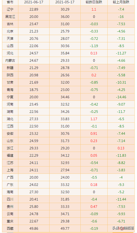 从局部看,全国有9个地区价格上扬,最高上涨了1.17元,而下跌的市场有17个,跌幅最多达到1.19元。从进入肉价上看,浙江价格达到29.33元/公斤,价格保持高企,而青海省以18.75元/公斤的价格,成为今日最低的价格。