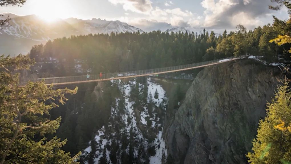 根据景点介绍,游客在桥上可以观赏到落基山脉和珀塞尔山脉,下方则是200英尺高的瀑布,公园设有森林小径、峡谷秋千和高空滑索,适合一家老小家庭乐。