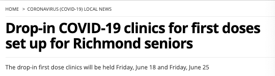 温哥华沿岸卫生局(Vancouver Coastal Health)在周三发表的声明中表示,列治文将为65岁或以上市民及其照顾者提供免预约的第一剂疫苗接种,并开设为期两天的临时注射站。