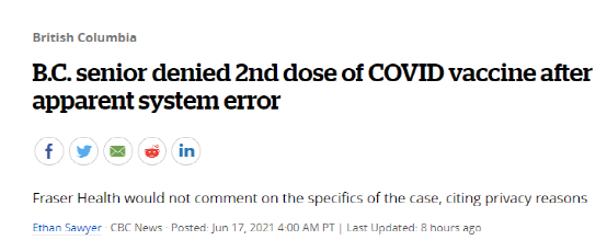 根据CBC的报道,BC 省 Mission 的一名 81 岁老人Chris Lindgren6月11日按照预约来到 Mission Memorial 医院的新冠检测和免疫中心接种第二剂新冠疫苗,但是却被负责这个接种点的菲沙卫生局的工作人员直接拒绝了,原因竟然是他已经在两天前接种过第二针了。老人感到一头雾水,自己神智清醒,打没打过疫苗还能不记得吗?