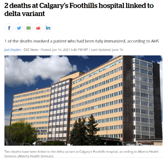 对于八旬老人来说,不能完整接种还是存在很大的危险性的,即使是两针都完整接种了,还是有可能被变种突破。根据CBC报道,阿省卡尔加里Foothills医院报告了两起新冠死亡案例,其中1名死者就是80岁的老人,他已经完全接种了2针疫苗。这场由Delta变种导致的医院大爆发,开始变得致命了。到目前为止,已有21名患者和9名医护人员确诊。令人感到害怕的是,中招的人中至少有11人已经完全接种,还有8人接种了1针。