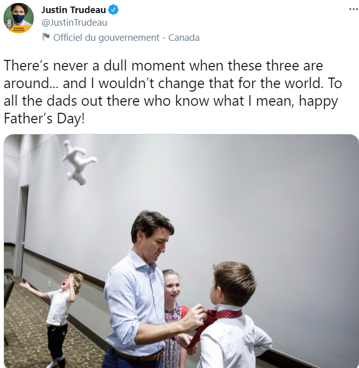 “和他们在一起,永远不会无聊 送给所有懂我这句话的爸爸们,父亲节快乐”。2020年的父亲节特鲁多的祝福。