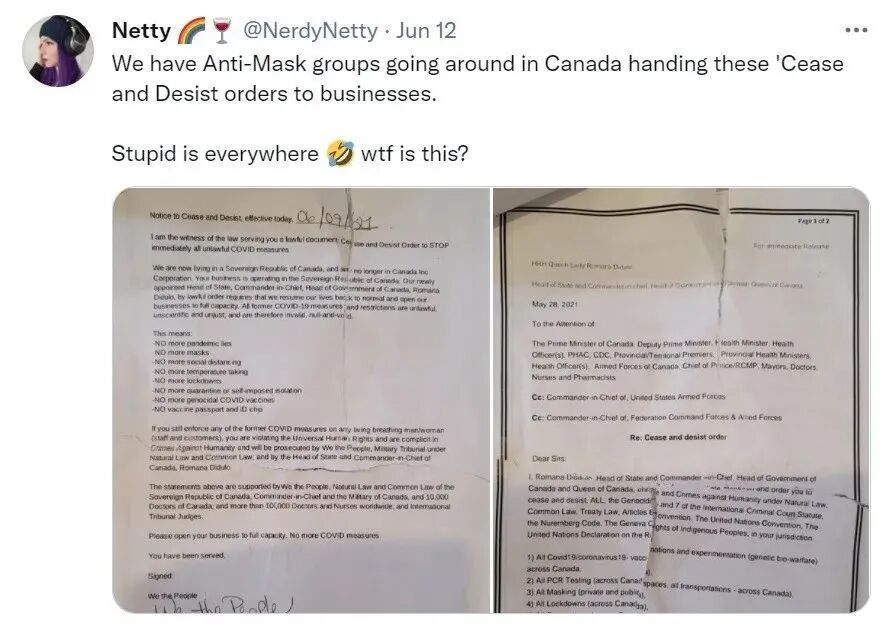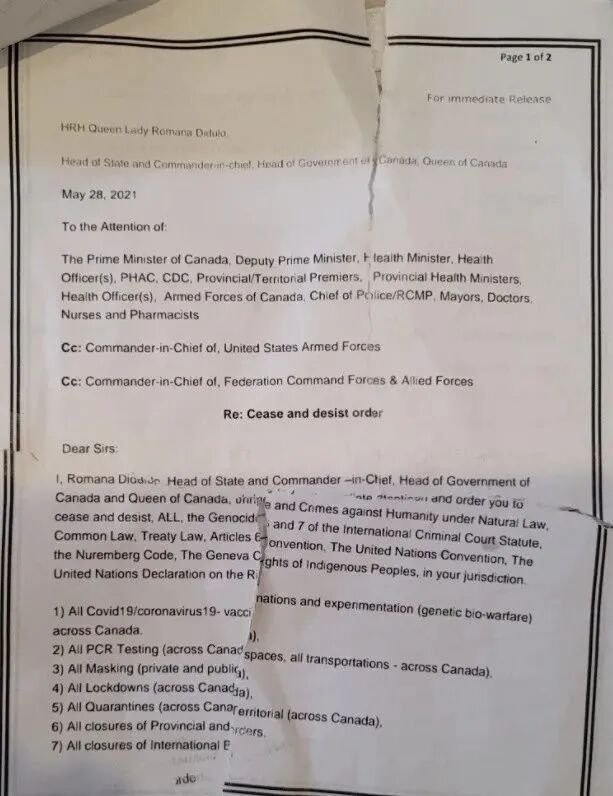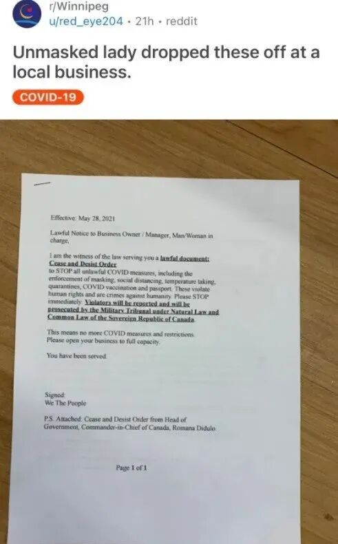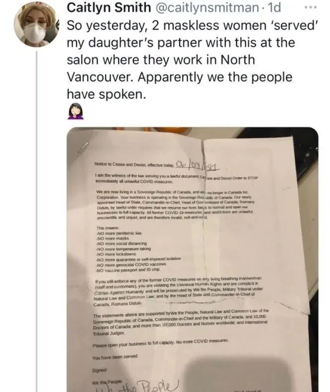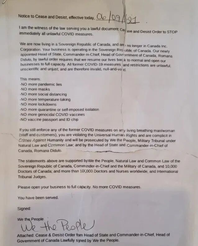 在这份通知书中称,现在的加拿大为加拿大共和国,要求重新开放小企业和经济,并称所有的防疫措施都是非法而无效的,包括戴口罩、保持社交距离、测体温等。