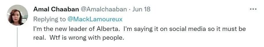 “我是阿尔伯塔的新省长。我都在社交网站上这么说了,那么它就一定是真的。这些人是有什么毛病。”