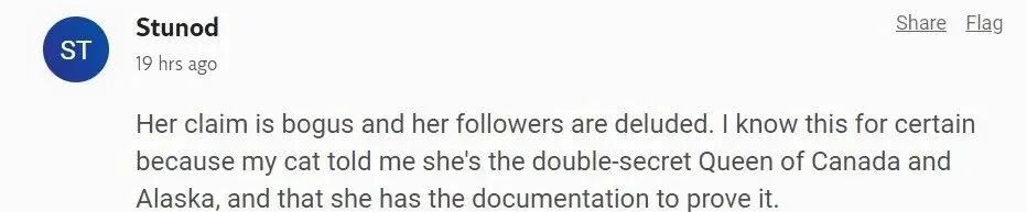 “她说的是假的,她的粉丝儿也都被骗了。我很确定,因为我的猫告诉我,它才是加拿大和阿拉斯加的秘密女王,并且它还有证明文件呢。”