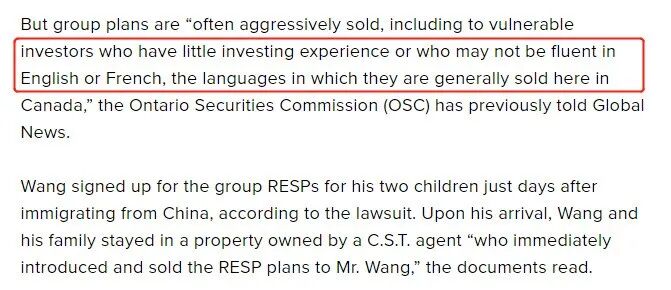 根据诉讼,原告王显示在从中国移民后几天就为他的两个孩子注册了团体 RESP。抵达后,王和他的家人住在一个 C.S.T.拥有的房产中。文件显示,代理人“立即向王先生介绍并出售了 RESP 计划”。