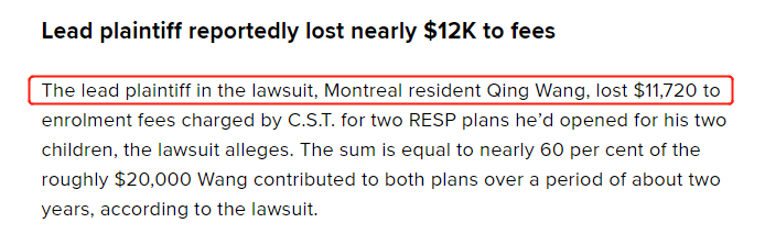 诉讼的首席原告、蒙特利尔居民王庆(音译:Qing Wang)因 C.S.T.收取的注册费损失了 $11,720。诉讼称,他为两个孩子开设的两个RESP 计划。这笔款项相当于王在大约两年时间里为这两个计划投入的约$20,000的近 60%。