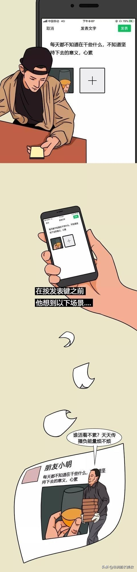 #90后开始退出朋友圈# 片段1:夜黑风高加班夜 他坐在出租车上 忍不住想发朋友圈感叹 片段2:自拍五分钟 修图两小时 迫不及待在朋友圈分享 片段3:买到心心念念的限量版 忍不住想发朋友圈炫耀 片段4:在网红美食店成功打卡 拍了九张精美的食物照 正好组成九宫格 片段5:工作遇到瓶颈 感觉自己一事无成 什么都做不好 片段6:跟男友大吵了一架 情绪在崩溃的边缘 好想要倾诉