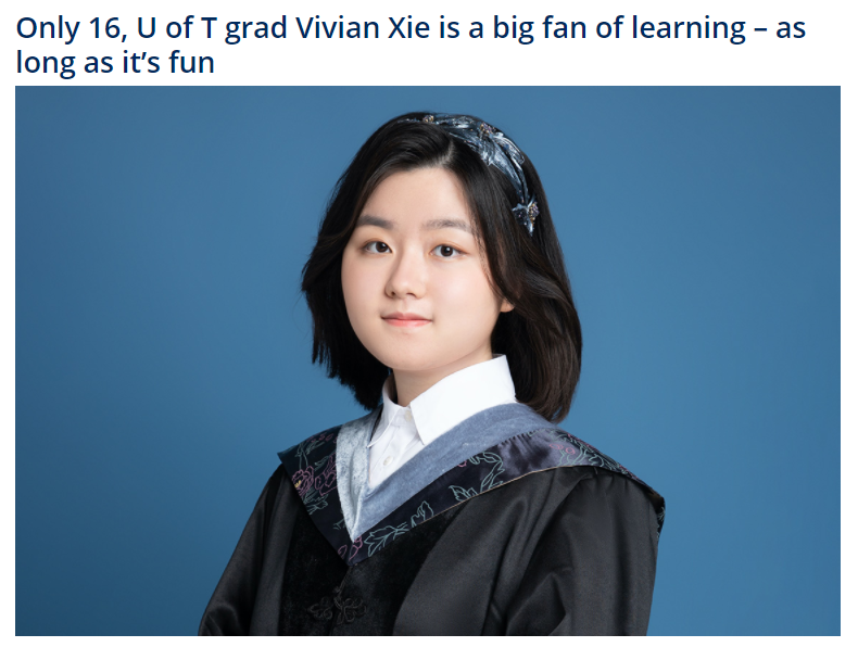 16岁的Vivian,在加拿大还不能买酒和投票,刚刚才满可以考驾照的年龄,却打破了多伦多大学40多年的纪录,成为三个校区自1979年以来最年轻的毕业生。