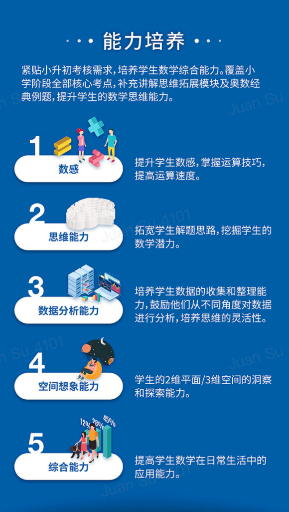 悟空资深教研团队自主研发的课程体系,紧贴小升初考核需求,覆盖了小学阶段全部核心考点,补充讲解思维拓展模块及奥数经典例题,全面培养孩子的: