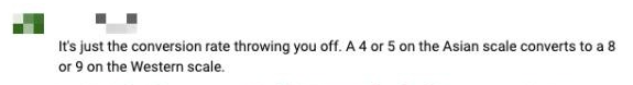 而有经验的朋友表示自己早就看淡了这个差距:“亚洲人的4、5分就是西方人的8、9分!”