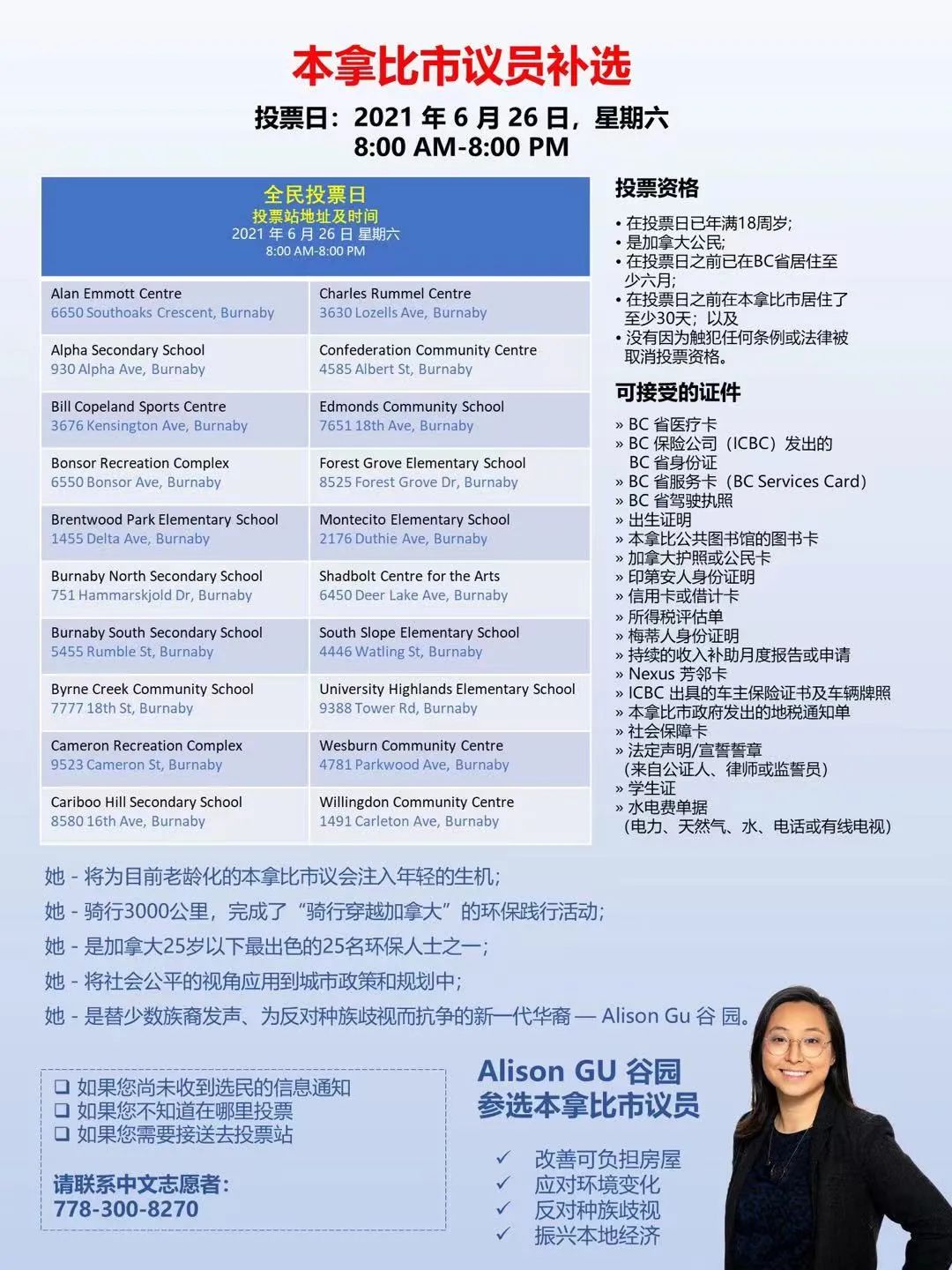目前,谷园(Alison Gu)已经成功获得Burnaby Citizens Association (BCA) 的推选,将代表BCA参加2021年6月26日举行的本拿比市地方政府补选,竞选本拿比市议员。希望获得大家的支持。