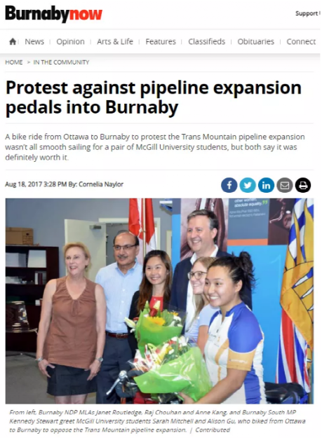 当年夏天,她骑自行车从渥太华出发,历时3个月,穿越多个省市,骑行3000公里直抵将建造横山输油管的终点——大温城市本拿比,筹得4461元的环保资金,因此而备受关注。