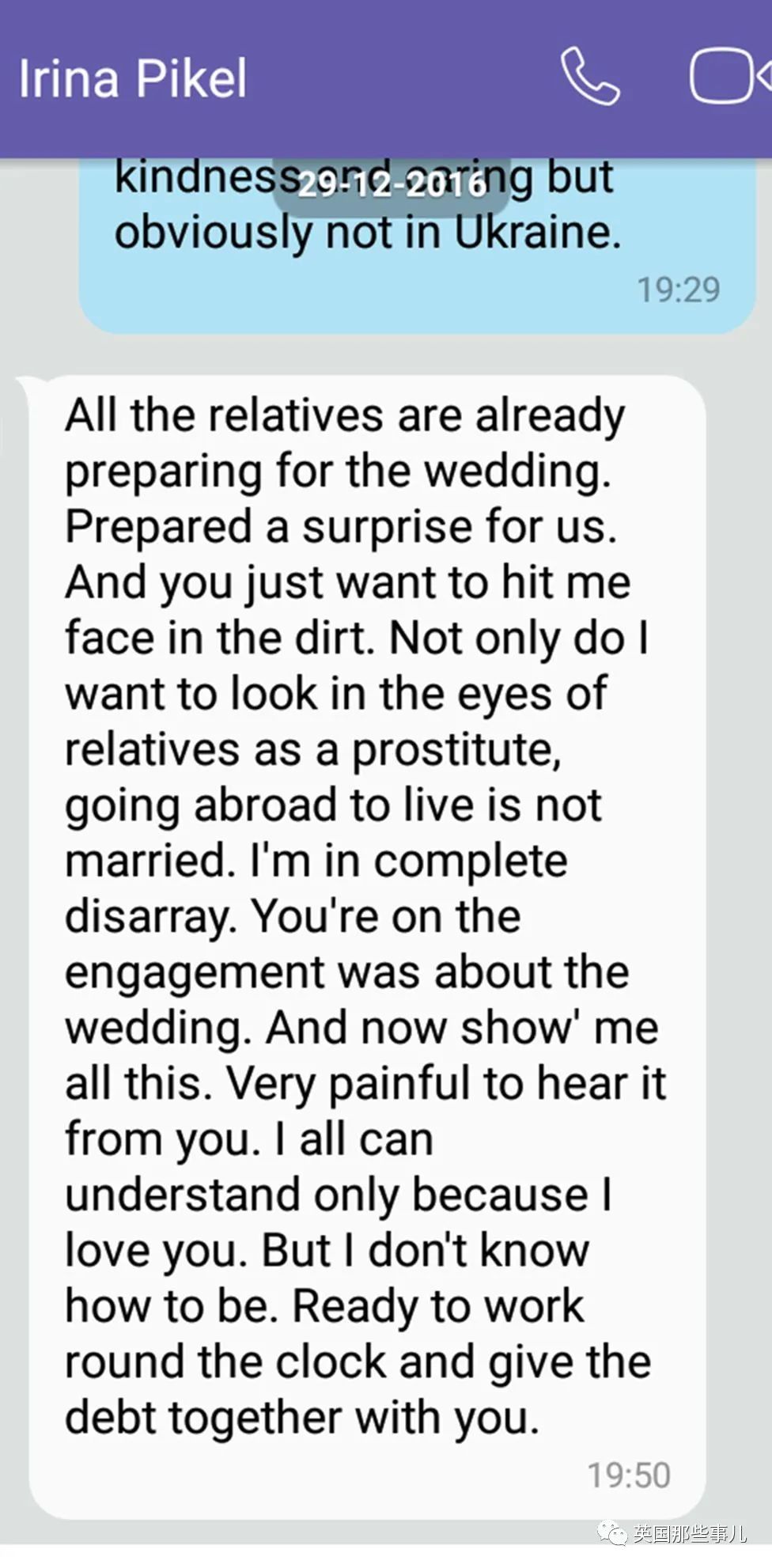 “你是想让我在亲戚眼里像个妓女吗!”伊琳娜在聊天软件中写道。